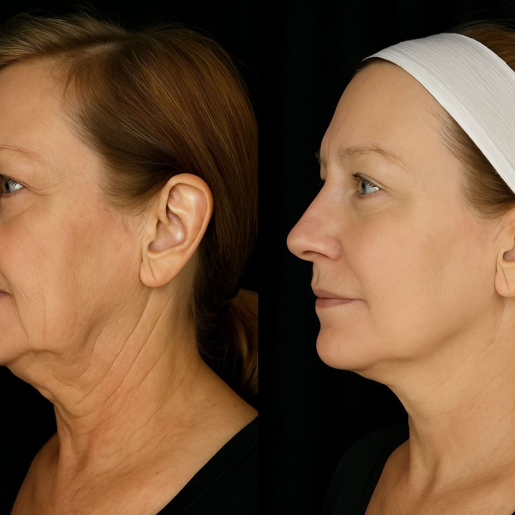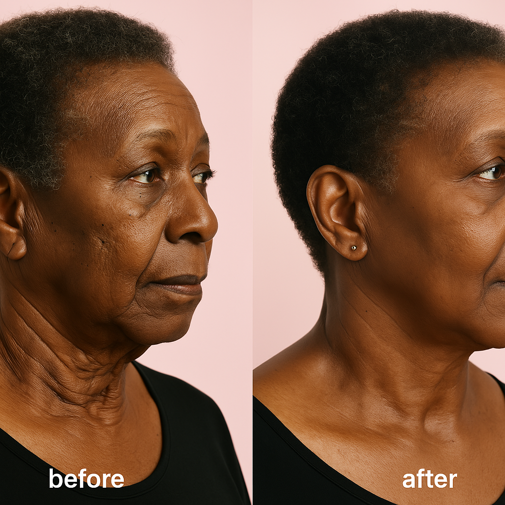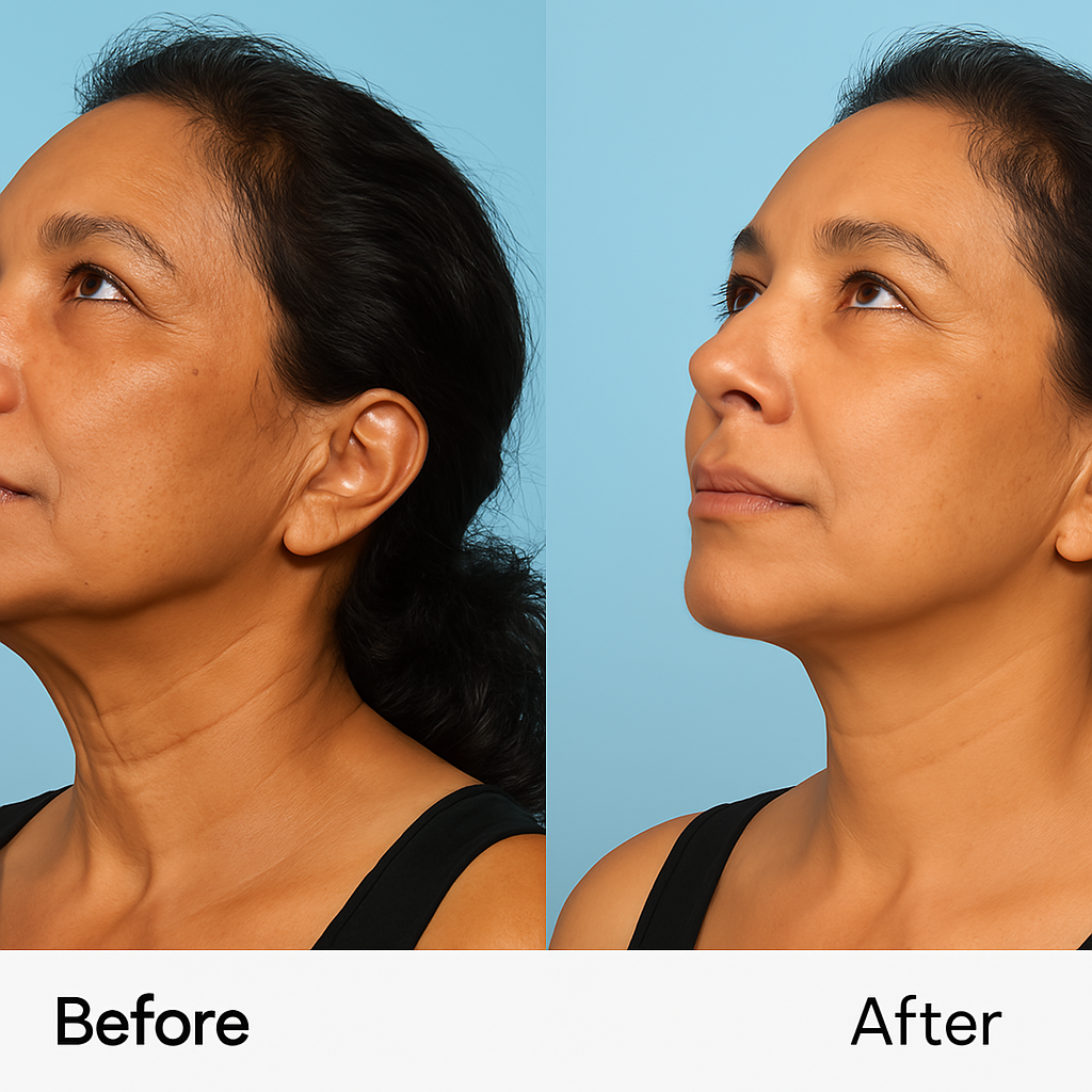 It lifts and tightens the neck and jowls to get rid of loose & saggy skin, reduce the appearance of “tech-neck,” and result in a more youthful appearance